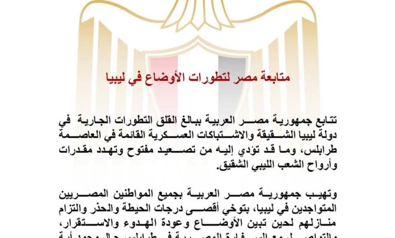 تتابع جمهورية مصر العربية ببالغ القلق التطورات الجارية في دولة ليبيا الشقيقة والاشتباكات العسكرية القائمة في العاصمة طرابلس، وما قد تؤدي إليه من تصعيد مفتوح وتهدد مقدرات وأرواح الشعب الليبي الشقيق.