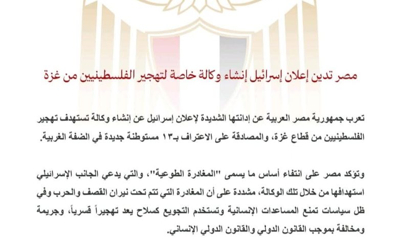 أعربت مصر عن إدانتها الشديدة لإعلان إسرائيل عن إنشاء وكالة تستهدف تهجير الفلسطينيين من قطاع غزة، والمصادقة على الاعتراف بـ١٣ مستوطنة جديدة في الضفة الغربية.