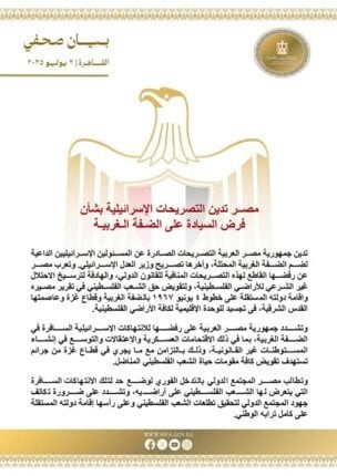 وتعرب مصر عن رفضها القاطع لهذه التصريحات المنافية للقانون الدولي، والهادفة لترسيخ الاحتلال غير الشرعي للأراضي الفلسطينية، ولتقويض حق الشعب الفلسطيني في تقرير مصيره واقامة دولته المستقلة على خطوط ٤ يونيو ١٩٦٧ بالضفة الغربية وقطاع غزة وعاصمتها القدس الشرقية، في تجسيد للوحدة الإقليمية لكافة الأراضي الفلسطينية.