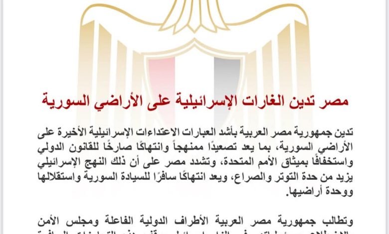 وشددت مصر – في بيان صادر عن وزارة الخارجية -على أن ذلك النهج الإسرائيلي يزيد من حدة التوتر والصراع، ويعد انتهاكًا سافرًا للسيادة السورية واستقلالها ووحدة أراضيها.