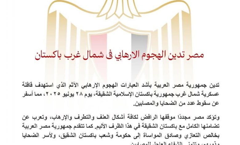 أدانت مصر بأشد العبارات الهجوم الإرهابي الآثم الذي استهدف قافلة عسكرية شمال غرب جمهورية باكستان الإسلامية الشقيقة، يوم ٢٨ يونيو ٢٠٢٥، مما أسفر عن سقوط عدد من الضحايا والمصابين.