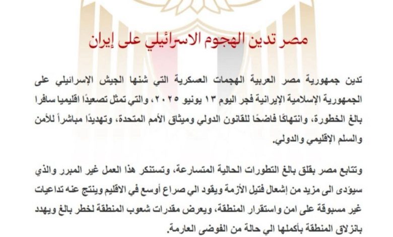أدانت مصر الهجمات العسكرية التي شنها الجيش الإسرائيلي على الجمهورية الإسلامية الإيرانية فجر اليوم ١٣ يونيو ٢٠٢٥، والتي تمثل تصعيدًا اقليميا سافرا بالغ الخطورة، وانتهاكًا فاضحًا للقانون الدولي وميثاق الأمم المتحدة، وتهديدًا مباشراً للأمن والسلم الإقليمي والدولي.