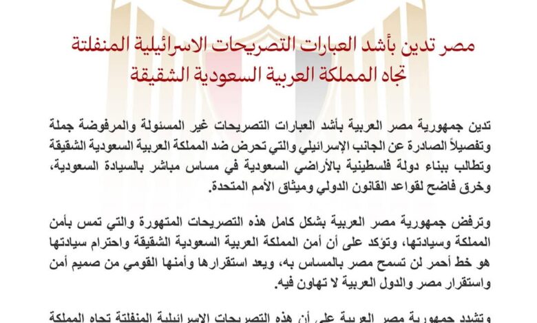 مصر تدين بأشد العبارات التصريحات الاسرائيلية المنفلتة تجاه المملكة العربية السعودية الشقيقة
