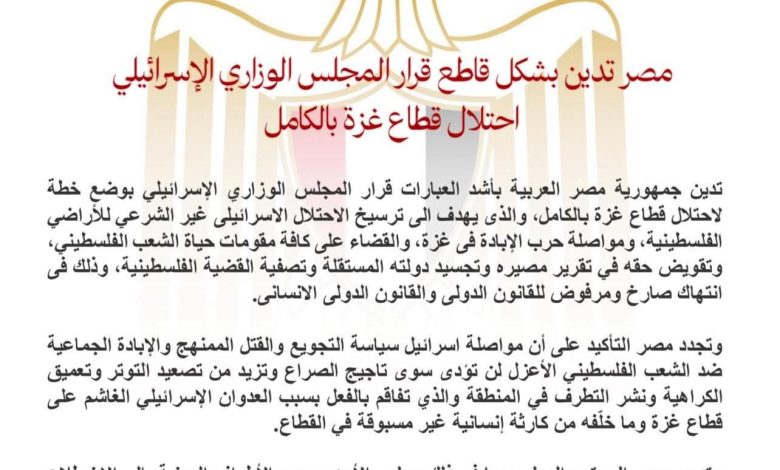 مصر تدين بشكل قاطع قرار إسرائيل احتلال قطاع غزة بالكامل