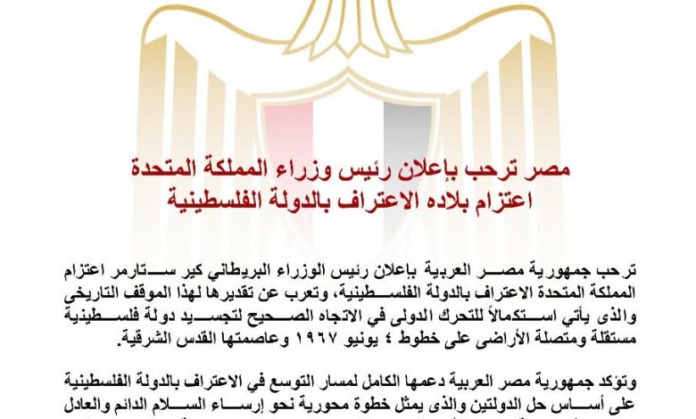 مصر ترحب بإعلان بريطانيا الاعتراف بالدولة الفلسطينية