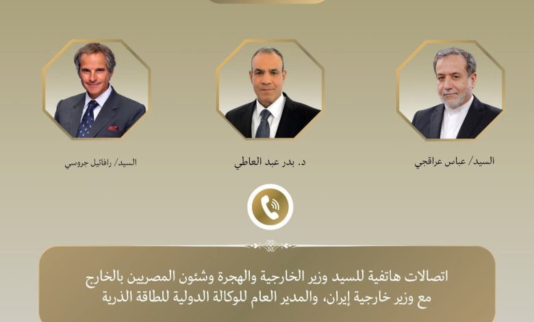 وأجرى عبد العاطي اتصالات مع عباس عراقجي وزير الخارجية الإيراني ورفائيل جروسي المدير العام للوكالة الدولية للطاقة الذرية خلال الفترة الأخيرة، بهدف تهيئة الظروف لاستئناف المفاوضات بين إيران والوكالة الدولية للطاقة الذرية حول الملف النووي الإيراني، وتقريب وجهات النظر بين الأطراف المعنية المختلفة بهدف التوصل لتسوية مستدامة تراعي مصالح جميع الأطراف وتسهم في خفض التصعيد واستعادة الثقة وإيجاد مناخ داعم لتحقيق الأمن والاستقرار الإقليمي.