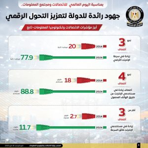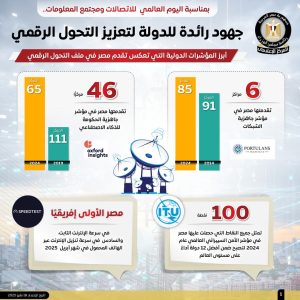 نشر المركز الإعلامي لمجلس الوزراء، مجموعة من الإنفوجرافات عبر منصاته على مواقع التواصل الاجتماعي، بمناسبة اليوم العالمي للاتصالات ومجتمع المعلومات، سلطت الضوء على الجهود الرائدة التي تبذلها الدولة لتعزيز التحول الرقمي، باعتباره محورًا رئيسًا لتحقيق التنمية المستدامة، وتبرز هذه الجهود ما تحقق في مجالات تطوير البنية التحتية التكنولوجية، وميكنة الخدمات الحكومية، وتحديث منظومة العمل الإداري، بما أسهم في تحسين جودة الخدمات المقدمة للمواطنين، ودعم الشفافية، ورفع كفاءة الأداء المؤسسي، إلى جانب تعزيز تنافسية الاقتصاد الوطني.