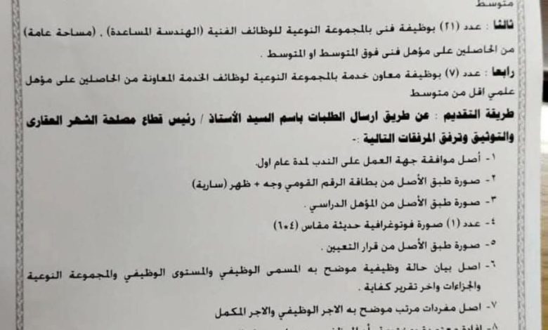 أعلنت مصلحة الشهر العقاري والتوثيق عن حاجتها لشغل بعض الوظائف بها عن طريق الندب وفقا لأحكام القانون رقم (۸۱) لسنة ۲۰۱٦ ولائحته التنفيذية في التخصصات الآتية.