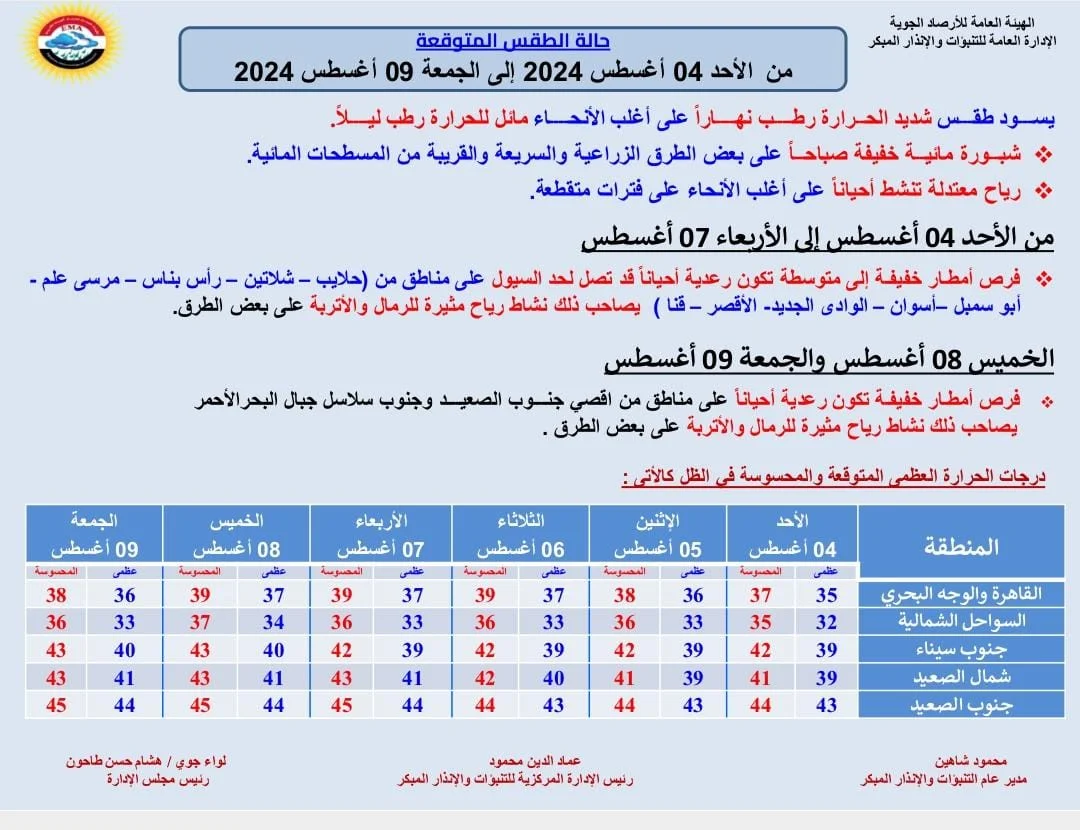 وسبق أن أكدت هيئة الأرصاد استمرار فرص سقوط الأمطار الخفيفة الى المتوسطة والرعدية أحيانا، التي قد تصل لحد السيول على مناطق من حلايب وشلاتين ورأس بناس ومرسي علم وأبو سمبل وأسوان والوادي الجديد والأقصر وقنا ويصاحب ذلك نشاط للرياح المثيرة للرمال والأتربة على بعض الطرق وتستمر الأجواء شديدة الحرارة وزيادة في نسبة الرطوبة.