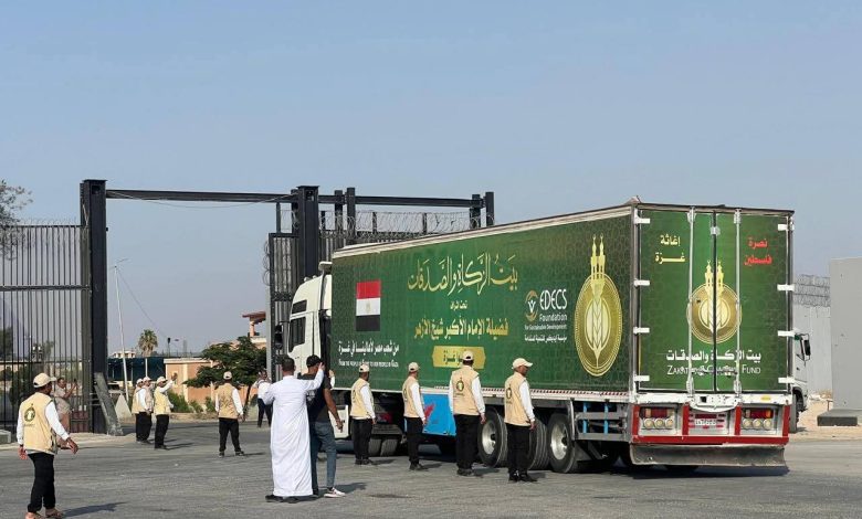 في إطار مواصلة دعم أشقائنا وإغاثتهم في قطاع غزة المحاصر، عبرت صباح اليوم الأحد، القافلة الإغاثية الحادية عشرة لبيت الزكاة والصدقات، بتوجيهات فضيلة الإمام الأكبر أ. د. أحمد الطيب، شيخ الأزهر، إلى قطاع غزة عبر معبر رفح البري على الحدود المصرية الفلسطينية؛ تمهيدًا لتوزيعها على أشقائنا الفلسطينيين الذين يتعرضون لحرب تجويع قاتلة منذ ما يقارب العامين، بعد أن وجَّه فضيلته بسرعة استئناف القوافل الإغاثية إلى غزة، عقب عودة دخول المساعدات إلى القطاع.