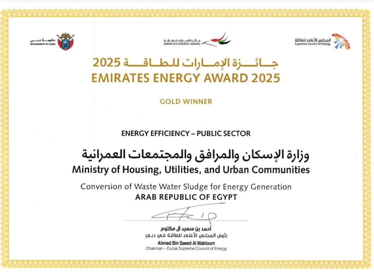 وزارة الإسكان تفوز بجائزة الإمارات للطاقة عن مشروع معالجة الحمأة وتحويلها إلى طاقة بالإسكندرية