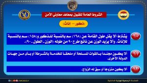 – ألا يقل الطول عن 168 سم للذكور و158 سم للإناث، مع تناسب الوزن وفق المعادلة المقررة.