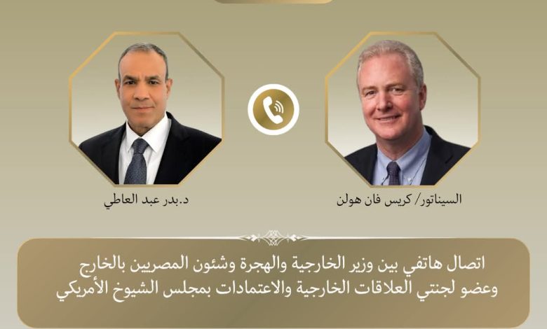 تلقى د.بدر عبد العاطي وزير الخارجية والهجرة وشئون المصريين بالخارج، اتصالًا هاتفيًا من السيناتور الديمقراطي”كريس فان هولن” عضو لجنتي العلاقات الخارجية والاعتمادات بمجلس الشيوخ الأمريكي، وذلك في إطار التواصل والتنسيق المستمر مع قيادات وأعضاء الكونجرس الأمريكي.