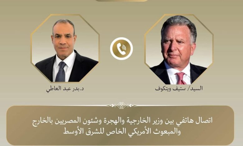 جرى اتصال هاتفى بين د. بدر عبد العاطى وزير الخارجية والهجرة و”ستيف ويتكوف” المبعوث الامريكى الخاص للشرق الأوسط.