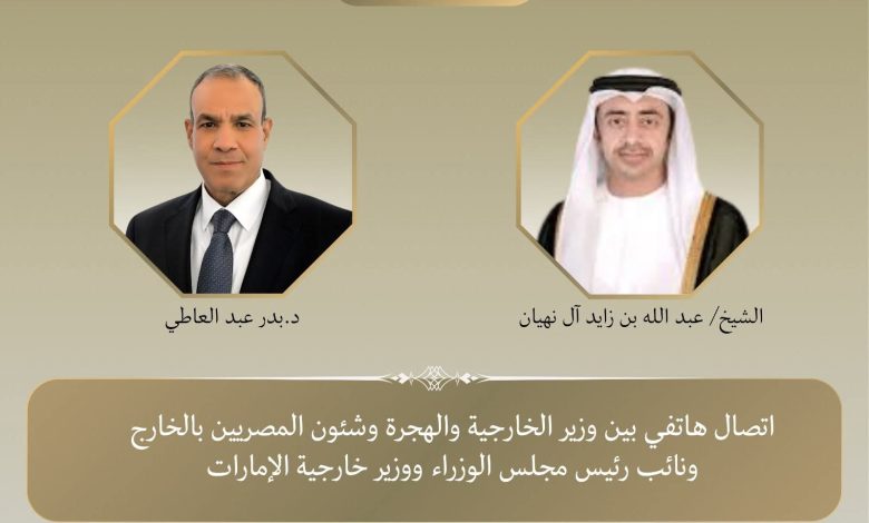 جرى اتصال هاتفي بين د. بدر عبد العاطي وزير الخارجية والهجرة وشئون المصريين بالخارج، وسمو الشيخ عبد الله بن زايد آل نهيان نائب رئيس مجلس الوزراء ووزير الخارجية بدولة الإمارات العربية المتحدة الشقيقة، اليوم الخميس ٢٢ يناير، وذلك في إطار التشاور والتنسيق المستمر بين البلدين الشقيقين إزاء سبل دعم العلاقات الثنائية، وبحث عدد من القضايا الإقليمية ذات الاهتمام المشترك.