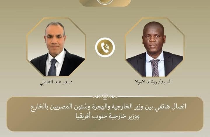 جرى اتصال هاتفي بين د. بدر عبد العاطي وزير الخارجية والهجرة وشئون المصريين بالخارج والسيد رونالد لامولا وزير خارجية جنوب أفريقيا يوم الأربعاء ١٣ أغسطس، حيث تناول الإتصال سُبل تعزيز العلاقات الثنائية بين البلدين الشقيقين في مختلف المجالات، وبحث القضايا الإقليمية والدولية ذات الاهتمام المشترك خاصة في ظل رئاسة جنوب أفريقيا لمجموعة العشرين.
