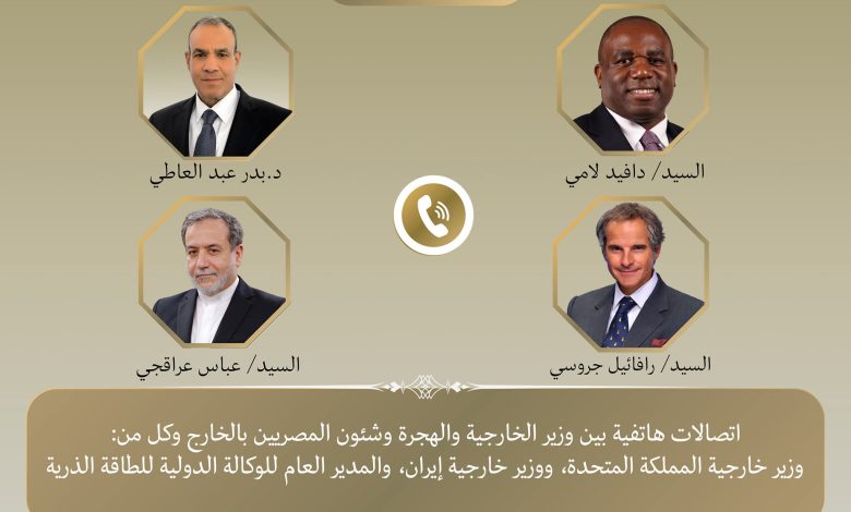 واصل د. بدر عبد العاطى وزير الخارجية والهجرة اتصالاته المكثفة لخفض التصعيد بالمنطقة، حيث جرت اتصالات بين وزير الخارجية والسيد ديفيد لامى وزير خارجية المملكة المتحدة، والسيد عباس عراقجى وزير الخارجية الايرانى، والسيد رافائيل جروسى المدير العام للوكالة الدولية للطاقة الذرية.