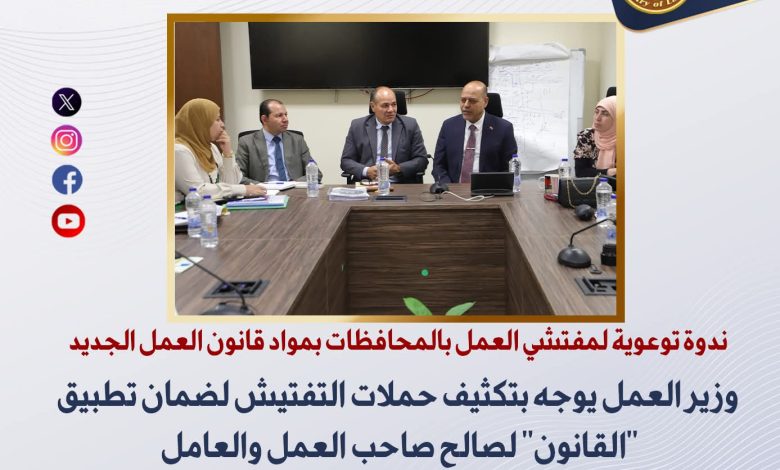 جاء ذلك خلال ندوة تثقيفية إنعقدت بمقر “الوزارة” بالعاصمة الإدارية الجديدة ،حاضر فيها إيهاب عبدالعاطي المُستشار القانوني للوزير ، والسيد الشرقاوي مدير عام تفتيش العمل بوزارة العمل ، بحضور مفتشي العمل من عدد من المديريات بالمحافظات، لتوعيتهم بمواد قانون العمل الجديد ،و بأهمية الإستمرار في تكثيف الجهود لتطبيق القوانين خاصة التوعية بمواد قانون العمل رقم 14 لسنة 2025 .