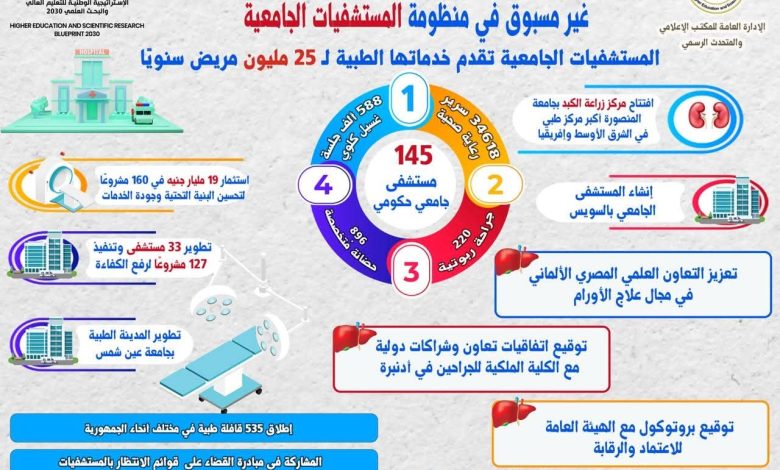 وفي إطار تطوير الخدمات الصحية بالمستشفيات الجامعية، تم استثمار 19 مليار جنيه في 160 مشروعًا لتحسين البنية التحتية وجودة الخدمات، شمل ذلك تطوير 33 مستشفى، وتنفيذ 127 مشروعًا لرفع الكفاءة، ومن أبرز المشروعات افتتاح مركز زراعة الكبد بجامعة المنصورة أكبر مركز طبي في الشرق الأوسط وإفريقيا بتكلفة مليار جنيه، وإنشاء المستشفى الجامعي بالسويس بتكلفة 2.4 مليار جنيه، الذي يتضمن 17 عيادة، و15 غرفة عمليات، و260 سريرًا، بالإضافة إلى وحدات متخصصة، مثل: الغسيل الكلوي، والعناية المركزة، كما تم تطوير المدينة الطبية بجامعة عين شمس بتكلفة 10 مليارات جنيه، مع إضافة وحدات جديدة، مثل: حضانات الأطفال المبسترين، وزيادة أسرة العناية المركزة، وفي مستشفى سموحة الجامعي، تم افتتاح وحدة قسطرة الأوعية الدموية، ووحدة عناية القلب المجهزة بأحدث التقنيات، وفي مستشفى المواساة، تم افتتاح مبنى مانشستر لدراسة الطب والجراحة، بالتعاون مع جامعة مانشستر، كما تم تطوير عدة وحدات أخرى في 5 مستشفيات عبر الفيديو كونفرانس، مثل: وحدة جراحات طب عيون الأطفال، ومركز السمع والاتزان؛ مما أسهم في تحسين الطاقة الاستيعابية وجودة الخدمات الطبية .